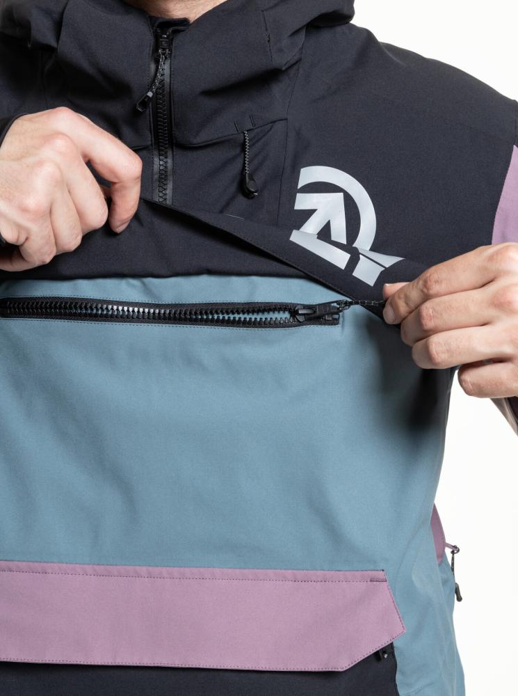 Co se týče kapes, Zenith je opravdu unikátní. Má prostornou klokaní kapsu na zip, samostatnou zipovou kapsu nad klokankou a skrytou zipovou kapsu pod klopou s termovložkou. Takže ať už potřebuješ uložit telefon, peněženku nebo klíče, máš kam to strčit. Větrání v podpaží je tu od toho, až budeš potřebovat trochu "vyvětrat". A kapuci i spodní část bundy si můžeš stáhnout, což je skvělé, když se počasí zhorší. A co je super, je snow catcher. To je ten sněhový elastický pás se zapínáním na druky a poutky pro uchycení ke kalhotám. Takže když se ti povede urvat nějaký ten pád nebo si jen budeš nasazovat boty, sníh ti neproleze pod bundu. A jako bonus, Zenith má zabudovaný hadřík na brýle v náprsní kapse. Takže když ti zamlží brýle, nemusíš je sundávat a drbat o rukáv.